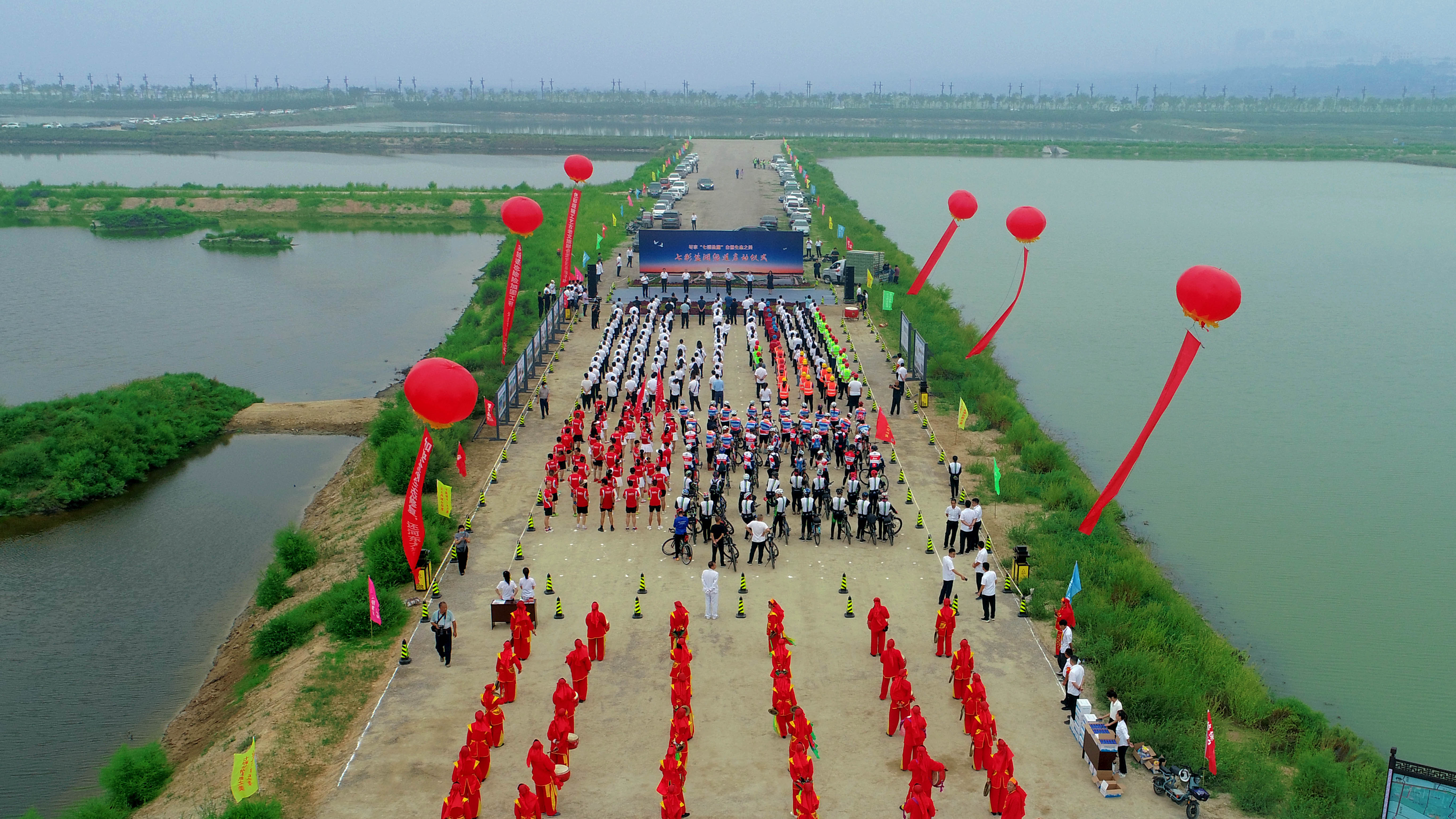 啟動(dòng)儀式由鹽湖生態(tài)保護(hù)與開(kāi)發(fā)中心主任孫冬青主持,市人大、市政協(xié)、市紀(jì)委監(jiān)委、市委宣傳部、市委組織部、鹽湖區(qū)委、區(qū)政府等23家市、區(qū)相關(guān)單位和各參建單位參加了啟動(dòng)儀式。市水投公司董事長(zhǎng)崔作銘介紹了鹽湖堤埝除險(xiǎn)加固及生態(tài)修復(fù)(一期)項(xiàng)目建設(shè)概況,市委常委、副市長(zhǎng)董旭光宣布七彩鹽湖綠道啟動(dòng)。百 人齊聚,千鴿展翅競(jìng)飛,共同見(jiàn)證了這一激動(dòng)人心的歷史時(shí)刻。同時(shí)在這里開(kāi)展了百人酷跑和騎行團(tuán)隊(duì)綠色環(huán)湖行。