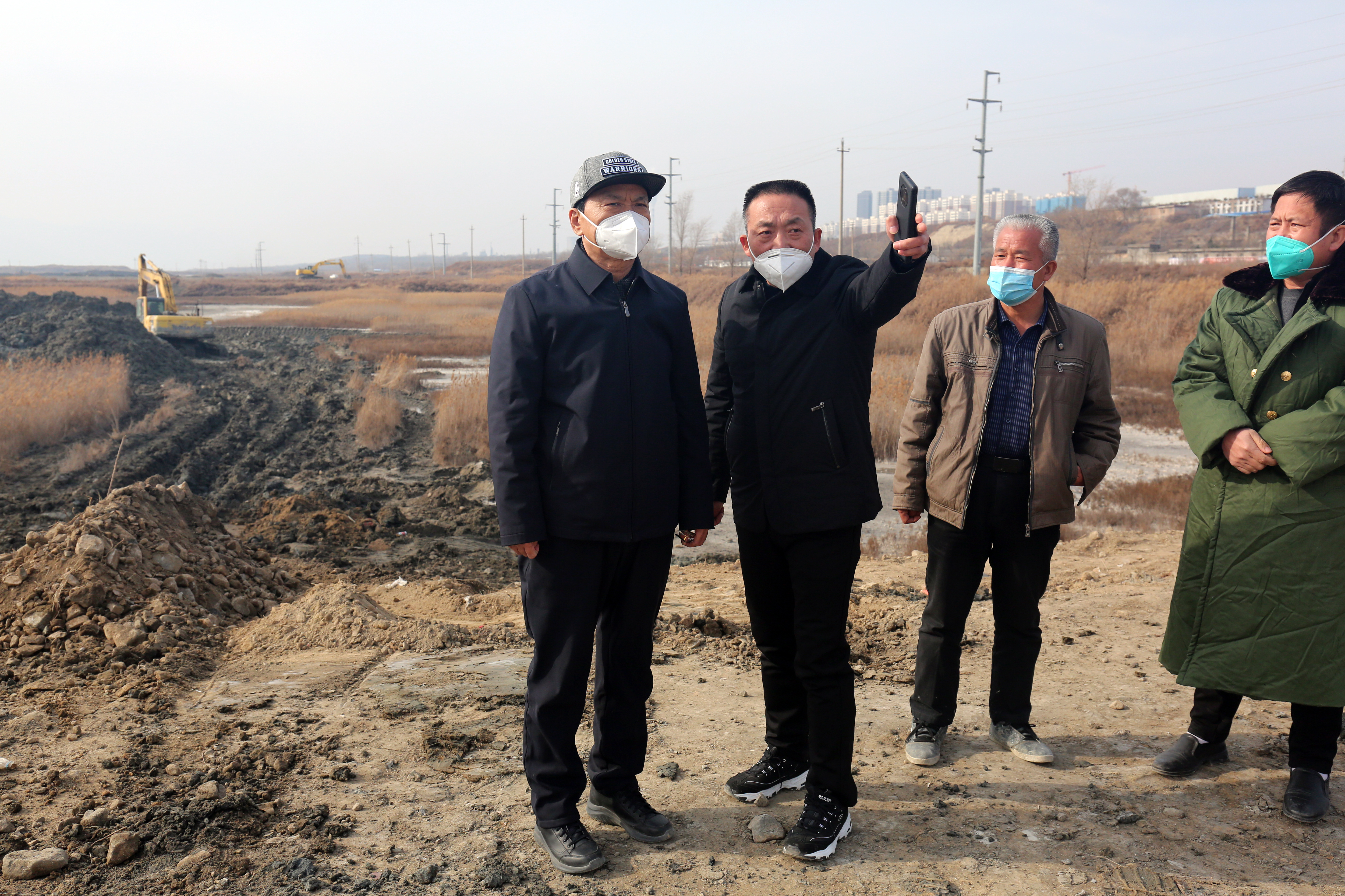 每到一處,詳細(xì)詢問施工人員康復(fù)情況、查看工地建設(shè)情況。干河清水復(fù)流段到處都是忙碌的工人,有安裝鋼壩閘的,有貼花崗巖的,有安裝欄桿的等;鹽湖生態(tài)治理工地上機(jī)械轟鳴,挖掘機(jī)、鏟車、挖泥船等20余臺大型機(jī)械有序運(yùn)作,施工人員搶抓工期,處處涌動著建設(shè)熱潮。