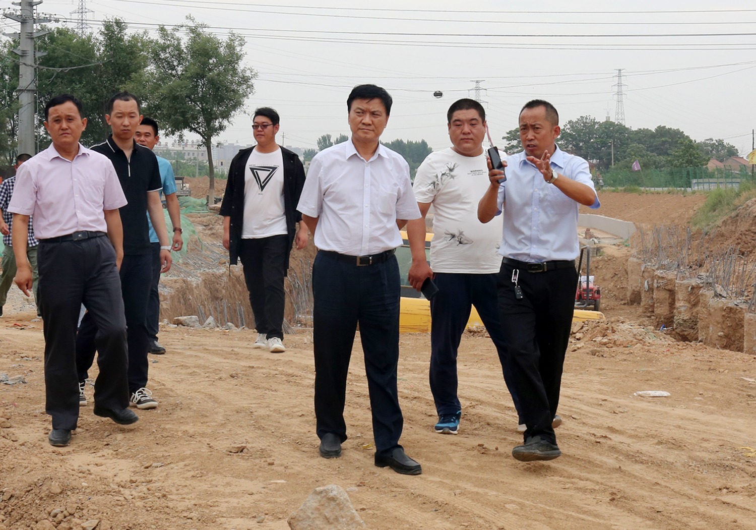 在施工現(xiàn)場(chǎng),崔作銘董事長(zhǎng)現(xiàn)場(chǎng)聽(tīng)取了項(xiàng)目部負(fù)責(zé)人對(duì)工程中存在問(wèn)題和建設(shè)進(jìn)度的匯報(bào)。查看了建華廠(chǎng)和左岸凰城段施工現(xiàn)場(chǎng)。針對(duì)施工中存在的無(wú)施工便道和進(jìn)度慢的問(wèn)題,他要求:一、建華廠(chǎng)段渠道施工,利用209國(guó)道護(hù)欄,將渠道和國(guó)道緊密結(jié)合,加快施工;二、左岸凰城段施工中無(wú)道路可行,以渠道做施工道路,輪替施工,橋梁施工加快速度,盡快實(shí)現(xiàn)通車(chē);三、項(xiàng)目部要加班加點(diǎn),加快建設(shè),力爭(zhēng)6月底完成渠道主體工程。